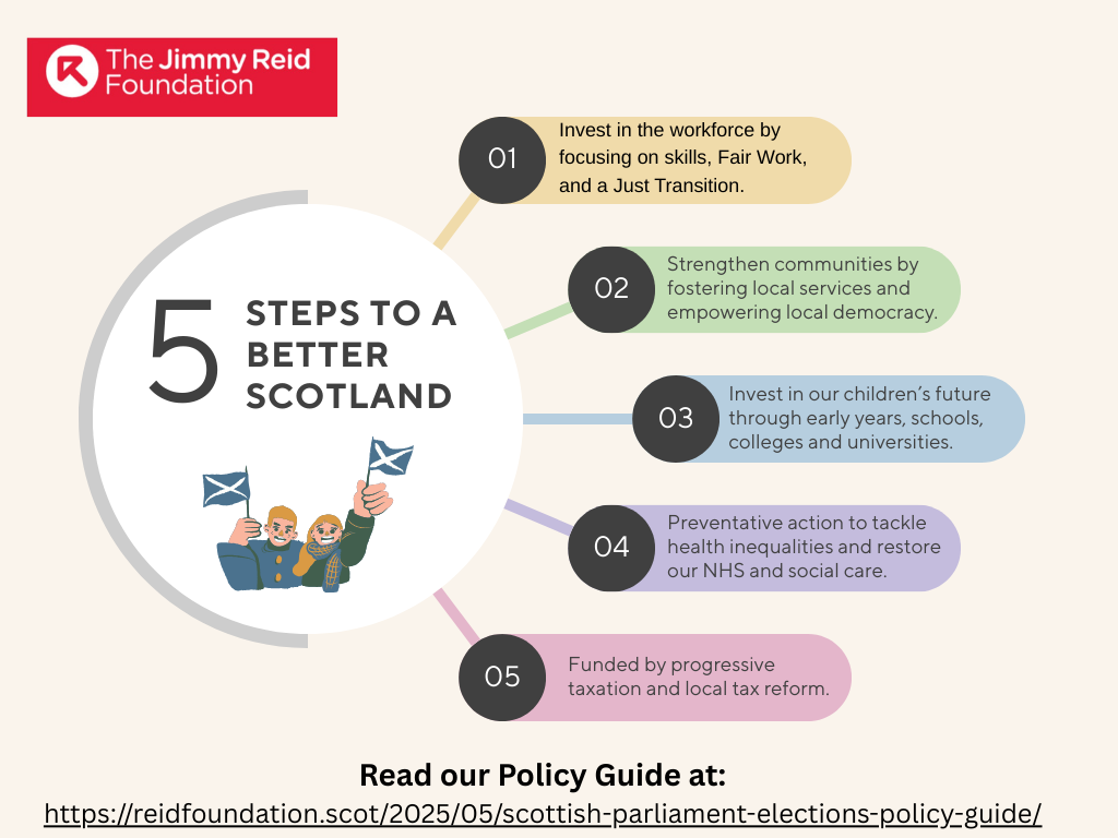 On economic policy, we argue that colleges should be the focus of reforming Scotland’s skills system, with investment in the apprenticeship system. There is an urgent need to decarbonise our economy, but plans for this transition have not been ambitious enough, and progress has been slow. Infrastructure investment needs to build on the public ownership of our bus companies and rail integration, coupled with procurement legislation reform. Economic development should help build the local economy with long-term, consistent funding. We set out the principles of progressive taxation to fund the investment we need and make better use of pension funds. For the workforce, we need to make Fair Work a reality by using all the levers of government.